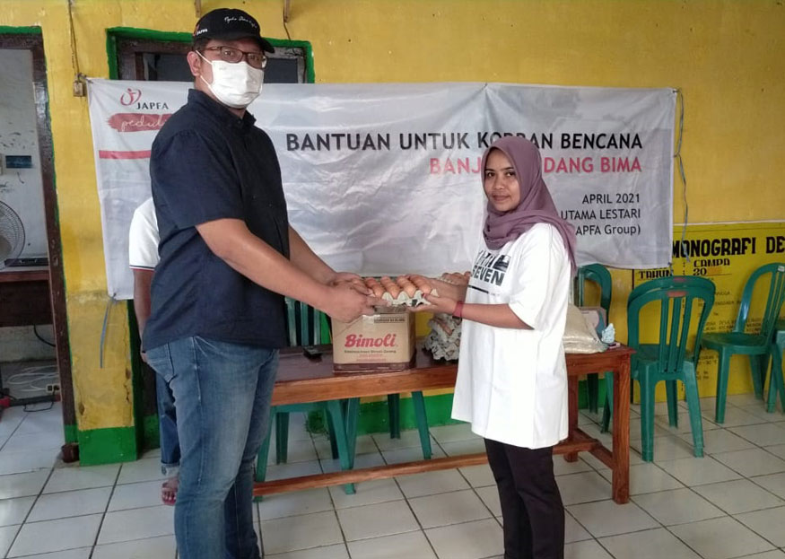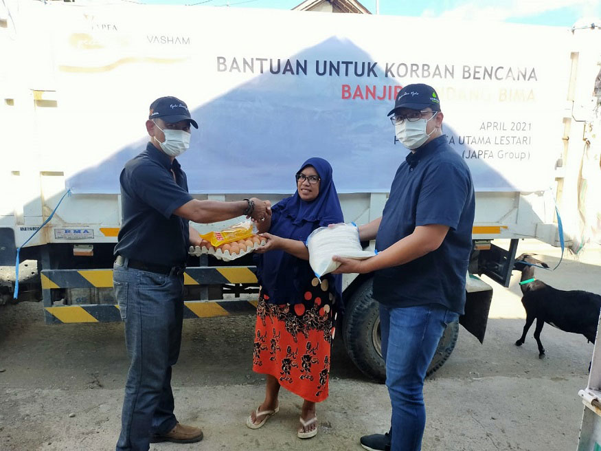 Bima, 12 April 2021 – Melalui program cepat tanggap bencana, JAPFA Peduli, PT JAPFA Comfeed Indonesia Tbk (JAPFA) bersama anak usahanya PT Santosa Utama Lestari (SUL), hari ini salurkan bantuan kepada warga terdampak banjir bandang di Kecamatan Madapangga, Bima, Nusa Tenggara Barat. Bantuan berupa paket sembako ini diberikan kepada 400 Kepala Keluarga di 7 Desa, yakni Desa Tonda, Desa Dena, Desa Rade, Desa Woro, Desa Ncandi, Desa Campa dan Desa Bolo.