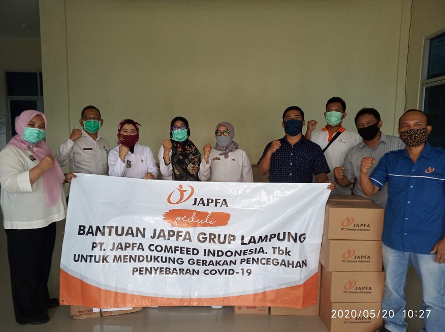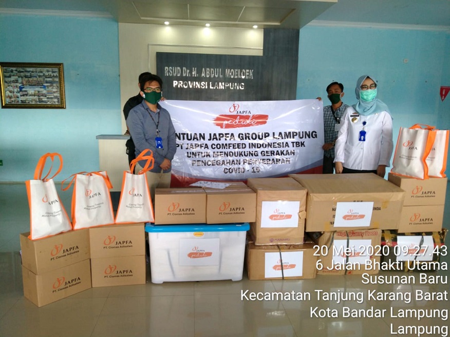 PT Japfa Comfeed Indonesia Tbk (JAPFA) bersama dengan anak usahanya di wilayah Lampung hari ini salurkan 700 Alat Pelindung Diri (APD) berupa face shield level 3, masker N95 8210, sarung tangan, sepatu boot, baju hamzat, surgical mask, dan kacamata medis, serta 21 dus makanan kering untuk tim medis COVID-19 di empat rumah sakit rujukan
